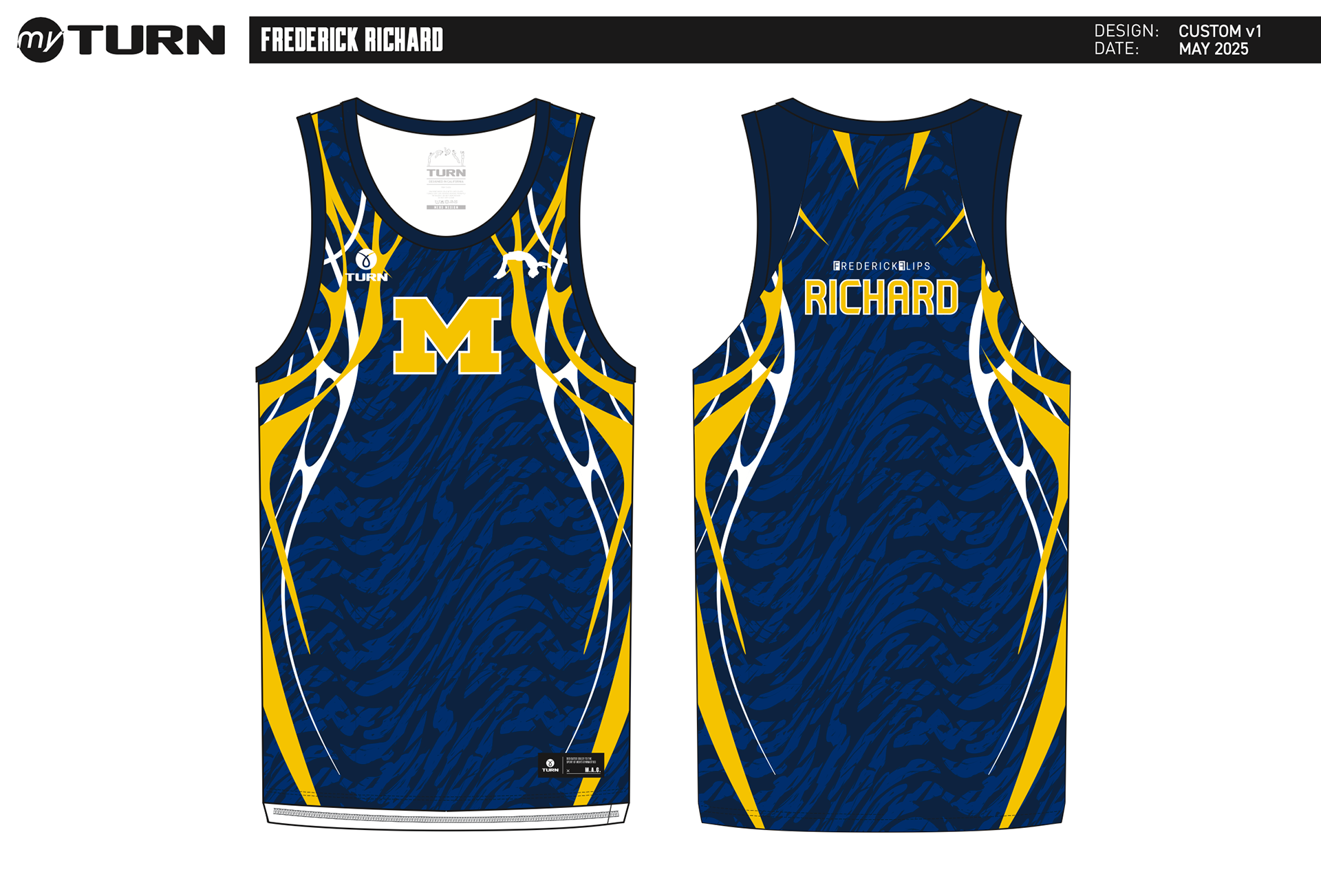 A design project for Turn Gymnastics on behalf of Olympic Bronze Medalist Frederick Richard as he continues to take point deductions in competition in an effort to transform the gymnastics uniform sport-wide. This uniform was worn for the 2025 US Gymnastics Nationals where Fred was the overall silver medalist and earned bronze in the high bar.